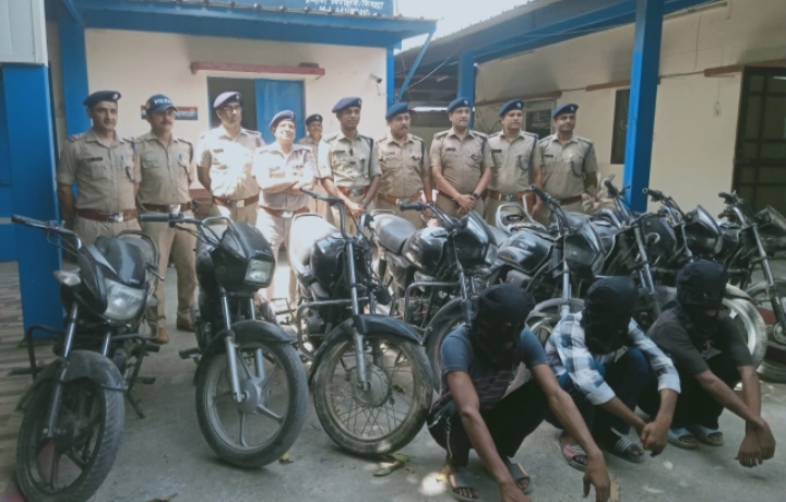 एसपी क्राइम चंद्रशेखर घोडके ने कोतवाली परिसर में जानकारी देते हुए बताया कि कोतवाल सुंदरम शर्मा के नेतृत्व में पुलिस टीम ने वाहन चैकिंग के दौरान हल्द्वानी रोड पर बेनी मजार के पास बिना नम्बर की एक बाइक पर सवार तीन युवकों को आते देखा जो पुलिस टीम को देखकर बाइक समेत भागने का प्रयास करने लगे जिसे पुलिस ने विफल कर दिया। बिना नम्बर बाइक सवार तीनों युवकों को हिरासत में लेते हुए बाइक के पेपर दिखाने को कहा तो वह पुलिस को गुमराह करने लगे। पुलिस के कड़े रवैये पर युवकों ने बाइक को दिनांक 02-05-24 को गुंजन पैलेस किच्छा से चोरी करना स्वीकार किया। पुलिस टीम द्वारा तीनों युवकों से कड़ी पूछताछ की तो तीनों बाइक चोरों की निशानदेही पर विभिन्न क्षेत्रों से चोरी की गई 07 अन्य बाइकें बरामद हुई।पुलिस पूछताछ में हिरासत में लिए गए युवकों ने अपने नाम सुकुम सिंह पुत्र शंकर सिंह निवासी गोल गेट थाना पंतनगर जिला उधम सिंह नगर, कृष्ण कुमार पुत्र प्रदीप कुमार निवासी बेनी कॉलोनी थाना पंतनगर जिला उधम सिंह नगर, आबिद अली उर्फ़ छन्नू पुत्र साकिर अली निवासी गोल गेट थाना पंतनगर जिला उधम सिंह नगर बताया। पुलिस ने तीनों बाइक चोरों के विरुद्ध मुकदमा दर्ज कर न्यायालय भेजा है। पुलिस टीम में प्रभारी निरीक्षक सुन्दरम शर्मा,एस एस आई विनोद जोशी, एसआई ओपी सिंह नेगी, एसआई विजय कुमार, एसआई अर्जुन सिंह, एसआई राजेंद्र पंत के अलावा एएसआई जगदीश मेहरा, कांस्टेबल त्रिलोक पांडे, खष्टी पाठक, मोनिया आदि शामिल थे।