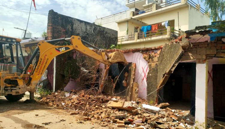 नानकमत्ता । नगर के मुख्य चौराहे पर जिला पंचायत की जमीन पर बनी अवैध 10 दुकानों पर प्रशासन ने बुलडोजर चलाकर ध्वस्त कर दी। इस दौरान भारी संख्या में पुलिस फोर्स तैनात रहीं।