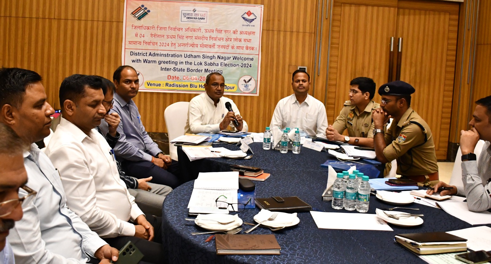 रुद्रपुर। जिला निर्वाचन अधिकारी उदयराज सिंह की अध्यक्षता में 04-नैनीताल-उधमसिंह नगर संसदीय क्षेत्र लोक सभा सामान्य निर्वाचन को शांतिपूर्ण व निर्वाध सम्पन्न कराने हेतु अन्तर्राज्यीय सीमावर्ती जनपद बरेली के प्रशासनिक व पुलिस अधिकारियों के साथ आपसी समन्वय बनाये रखने हेतु महत्वपूर्ण बैठक स्थानीय होटल में आयोजित हुई।