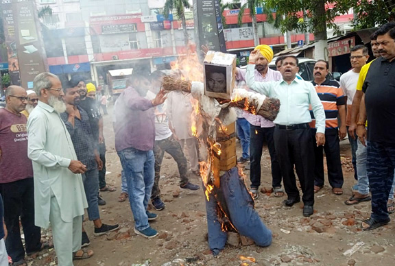 इससे पूर्व व्यापार मंडल अध्यक्ष संजय जुनेजा के नेतृत्व में व्यापारी रोडवेज के सामने एकत्रित हुए जहां से नारेबाजी करते हुए पीडी के पुतले की शव यात्रा प्रारम्भ की। व्यापारी नारेबाजी करते हुए जुलूस की शक्ल में एनएच कार्यालय के समक्ष पहुंचे। जहां पुतले को आग के हवाले कर दिया गया। संजय जुनेजा ने राषित स्वर में कहा कि एनएच के पीडी विकास कुमार हिटलर शाही तरीके से व्यापारियों का उत्पीड़न कर रहे हैं। जिसे किसी भी कीमत पर बर्दाश्त नहीं किया जायेगा। उन्होंने कहा कि व्यापारियों की दुकानों द्वेष भावना से तोड़ा गया है। वहीं अतिक्रमण हटाने के नाम पर दोहरी नीति भी अपनाई गई। उन्होंने कहा कि जी 20 सम्मेलन की आड़ लेकर एक ओर मुख्य मार्ग के काफी पीछे की दुकानों को तोड़ दिया गया जबकि एसएसपी कैंप कार्यालय से नगर निगम तथा रोडवेज व शराब भट्टी के भवनों पर पूरी तरह से छोड़ दिया गया। संजय ने कहा पीडी द्वारा अतिक्रमण हटाने के छह माह बीत जाने पर भी अभी तक रोड़ का चौड़ीकरण का कार्य शुरू नहीं किया जा सका है। जिससे साफ जाहिर है कि पीडी का मकसद सिर्फ व्यापारियों को मुख्य मार्ग से उजाड़कर बेरोजगार करना था। व्यापार मंडल अध्य़क्ष संजय जुनेजा ने कहा कि विभाग की तानाशाही के विरूद्ध व्यापारी शांत नहीं बैठेंगे। इस दौरान हरीश अरोरा, राजीव जोशी, हरजीत सिंह, नंद किशोर, इदरीस, सुमेर सिंह प्रजापति, सुनील जडवानी, इकराम मियां, श्याम ढींगरा, सिराजुद्दीन, किशन खुराना, सोनू बांगा, नरेन्द्र चावला, हरीश जुनेजा, इन्द्रजीत सिंह, दीपक ढींगरा, आशीष ग्रोवर, राजवीर सिंह, विपिन नारंग, राजीव जोशी, अमरजीत सिंह, अख्तर अली, मौ. इकबाल, राकेश कालड़ा, जसवीर सिंह, हबीब अहमद, सुनील कुमार, अरविंद देवल, हरजीत सिंह, कंवलजीत सिंह, गुरविन्दर सिंह, सत्यम अरोरा, राजू सोनकर, लालचन्द्र कालड़ा, जागीर सिंह, जगजीत सिंह, विनोद ठुकराल, सुनील बठला, रामलाल बठला, मुमताज , ललित मोहन, बनारसीराम ठुकराल, इसरार मियां, रमेश कालड़ा, प्रिंस बंसल आदि मौजूद थे।