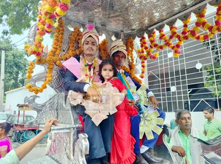 सात निर्धन कन्याओं का  समाजसेवियों ने  कराया सामूहिक विवाह गणमान्य लोगों ने वर वधू को दिया सुखी दाम्पत्य जीवन का आर्शीवाद सभी वरों की सज धज कर बैंड बाजों के साथ निकाली बारात
